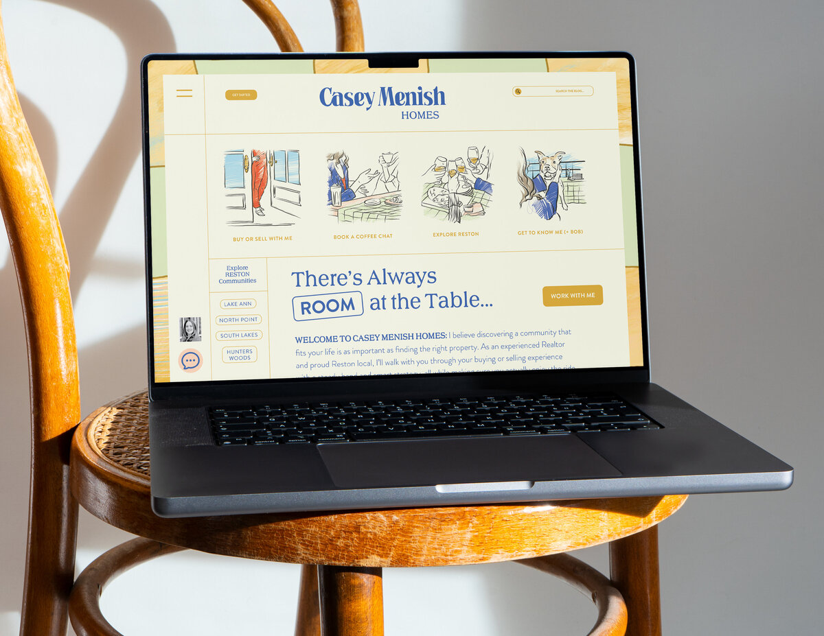 For Casey, we envisioned a series of small artistic scenes that would not only speak to her real estate service (Casey’s warm welcome in the doorway of a home ready for touring; animated hands in motion during a client coffee consult), but to Casey’s personal story (including her dog, Bob) and the rituals of the Reston lake lifestyle.
