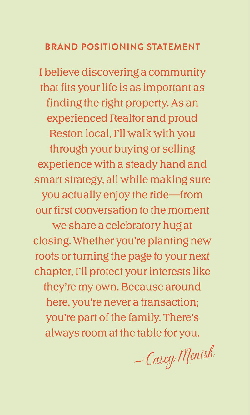 From there we developed Casey’s precise brand mission and promise statements, articulated her personal story in real estate, and laid the strategic foundation for all future marketing copy.